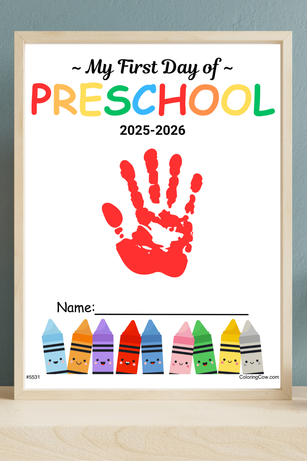 The printable features a bright, colorful title at the top and a row of smiling crayons along the bottom. There’s a blank space in the middle that’s perfect for adding a handprint using paint, markers, or colored ink pads. A name line is included so you can write your child’s name, and with the personalize tool, you can add a custom date or short message before printing.